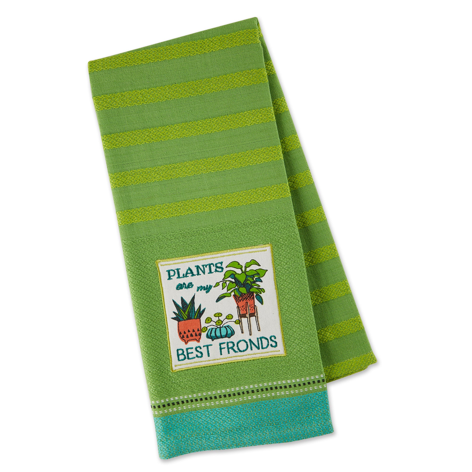 Embellished dishtowel features applique patch with garden shed plant design with Plants Best Fronds | 18 x 28" | 100% Cotton | Machine wash cold separately | Gentle cycle | Tumble dry low | Low iron | Wash separately before use