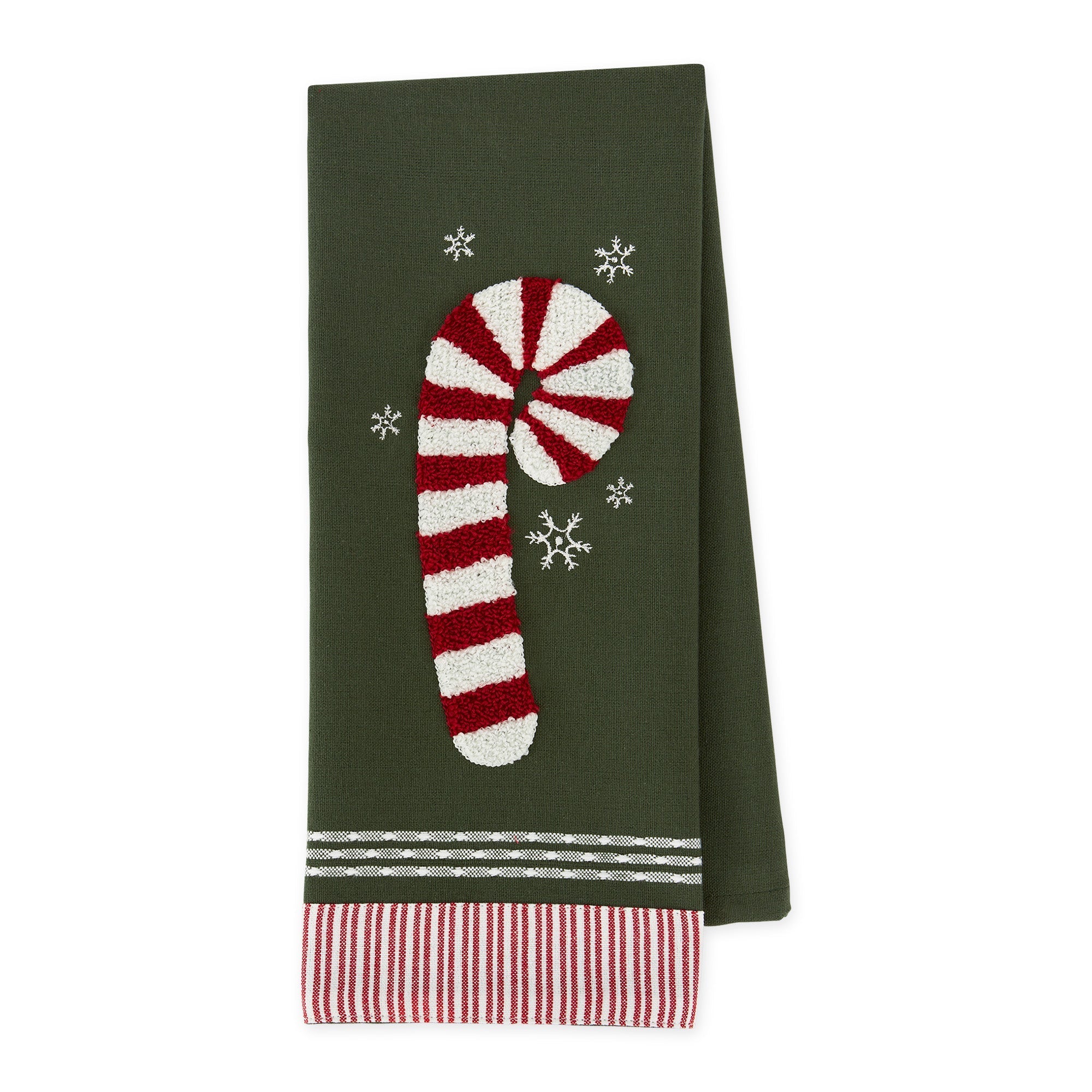 Dishtowel is embellished with a flocked embroidery candy cane and bottom hem is finished with 1.5-inch candy cane stripe applique piecing