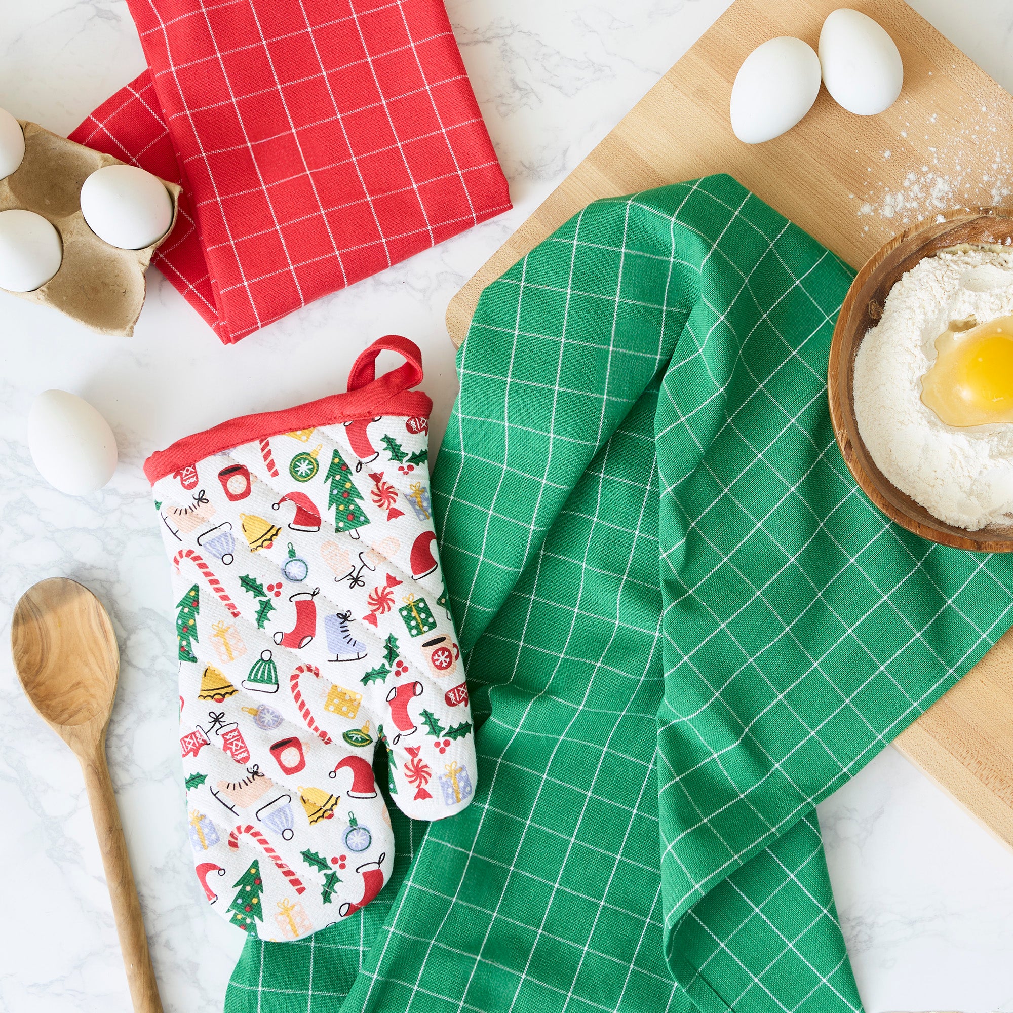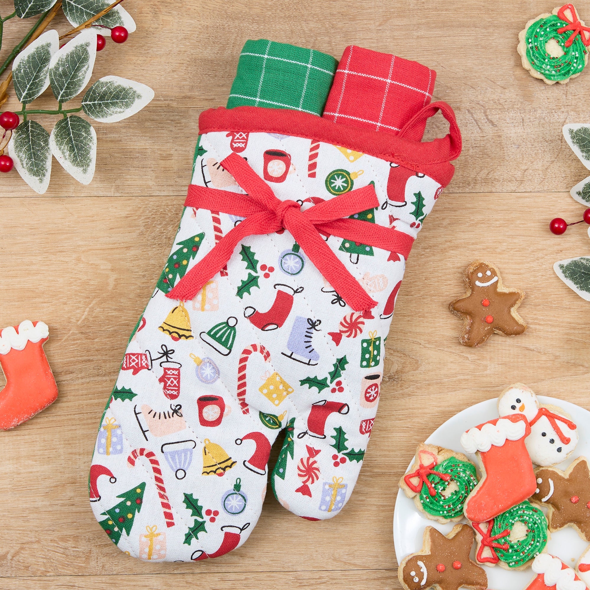 - Soft, absorbent cotton towels are perfect for drying dishes and kitchen chores. Heat-resistant oven mitt helps protect hands while baking or cooking holiday meals