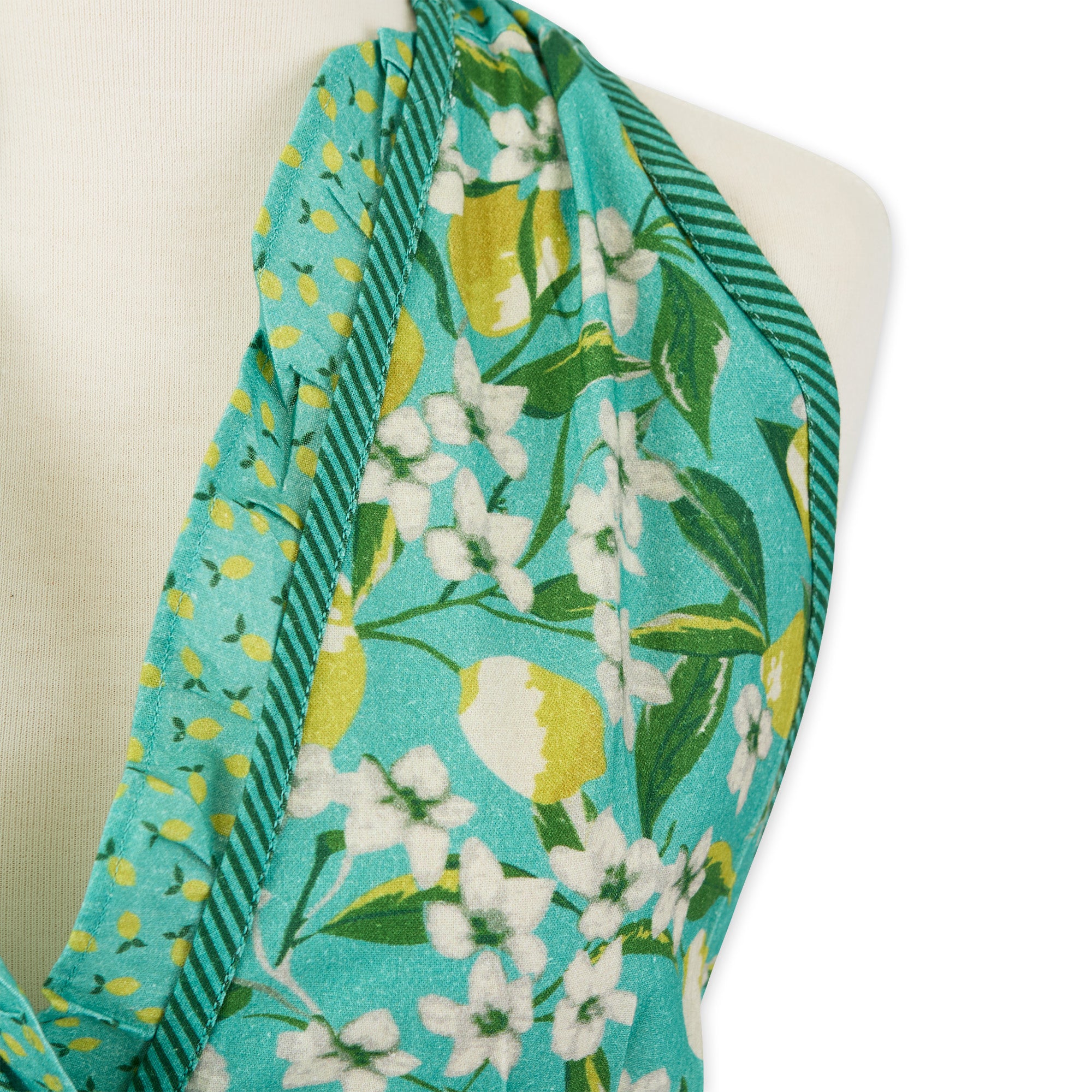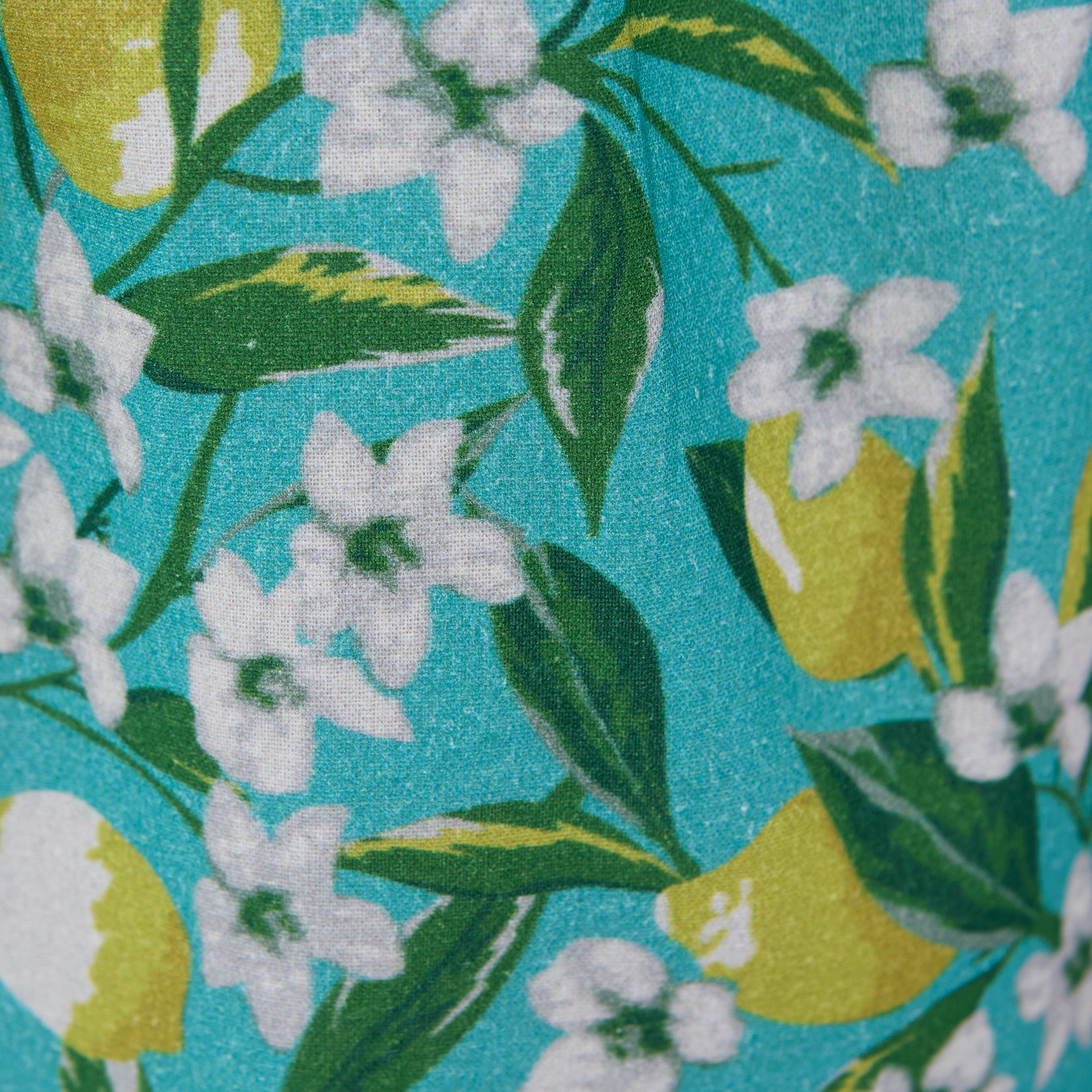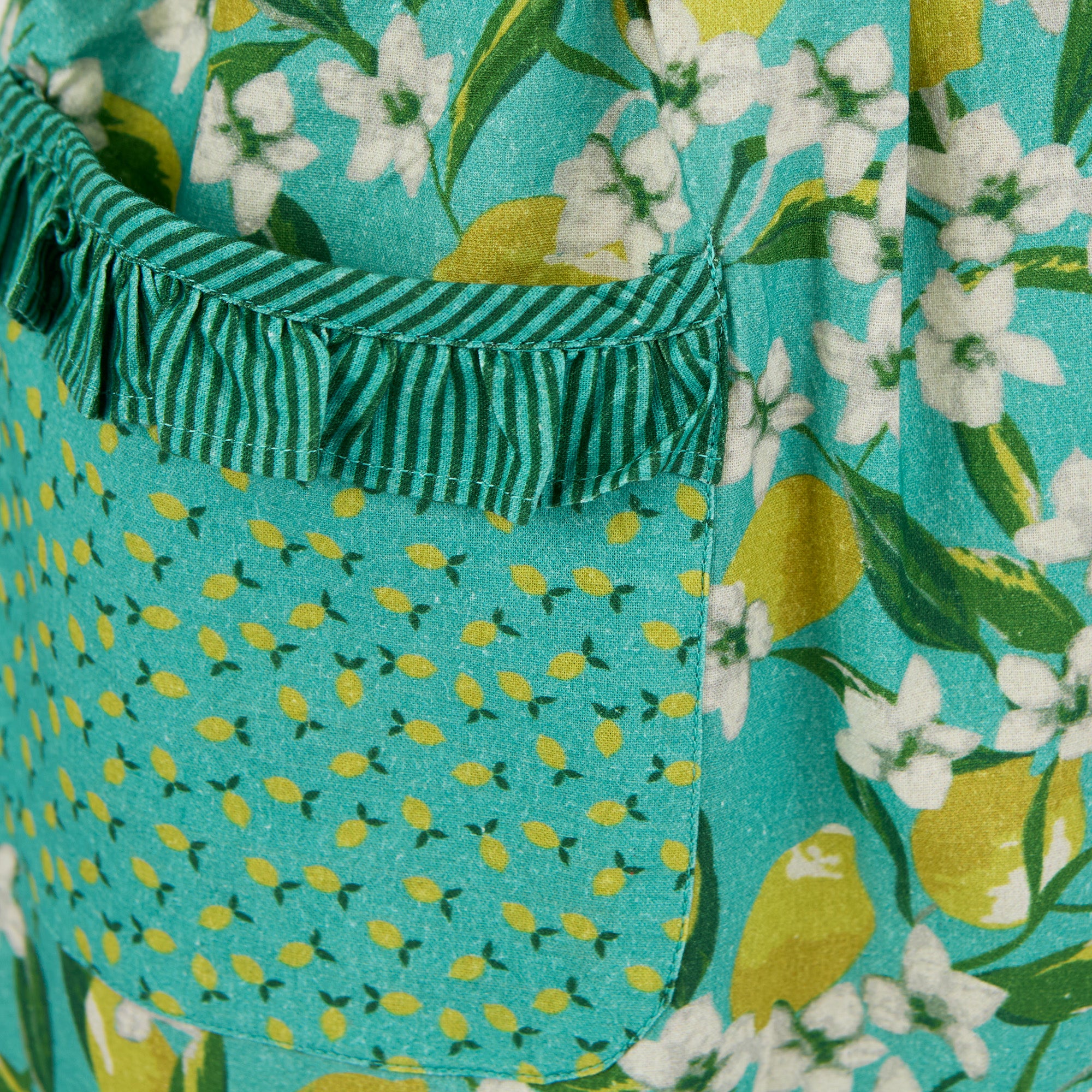 - Ruffled edges, contrast-print details, and a coordinating waistband trim add layered style and visual appeal.